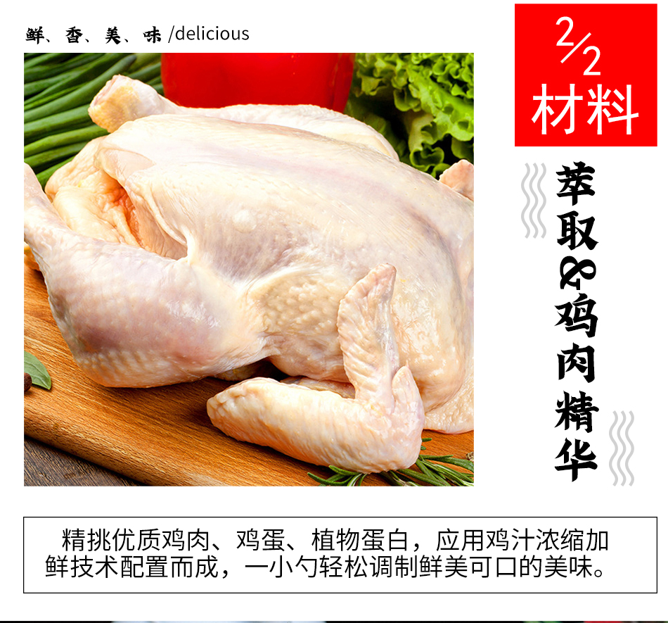 產(chǎn)品特點:雞汁特鮮,香氣濃郁。