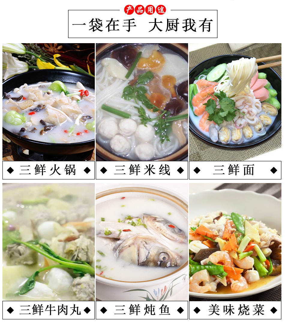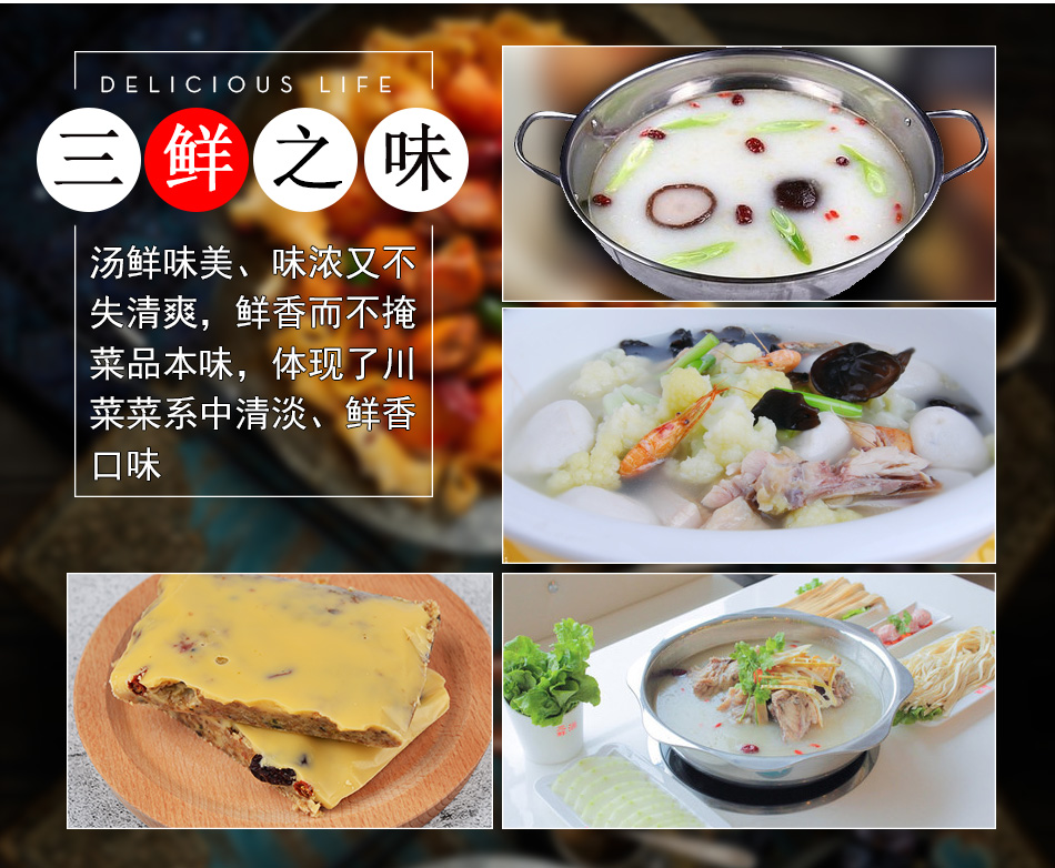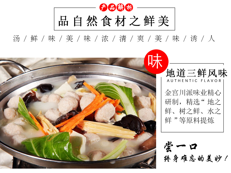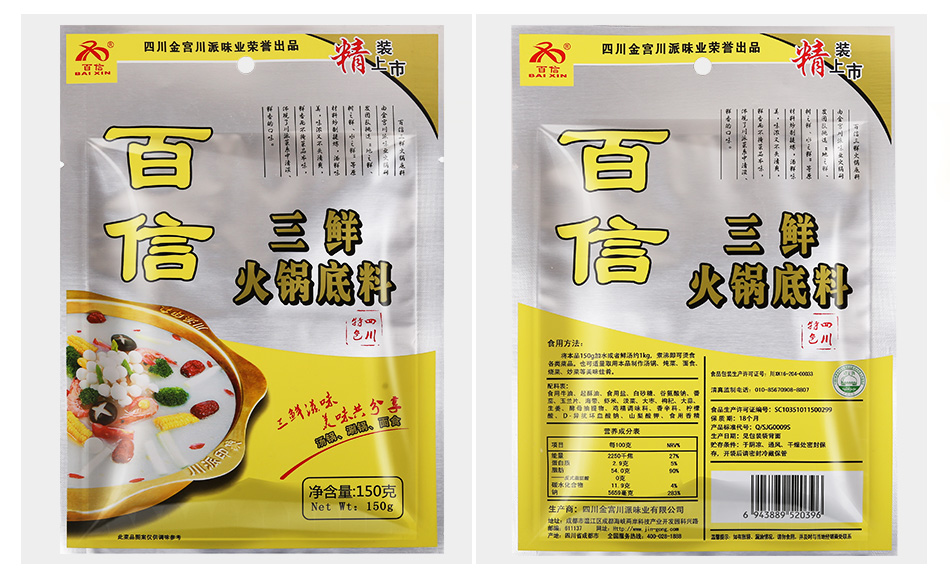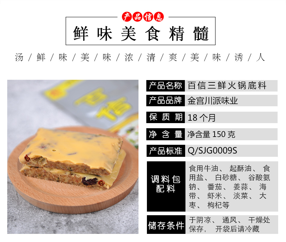 產(chǎn)品簡介:百信三鮮火鍋底料是采用天然原料,經(jīng)川派火鍋特級配料師多年潛心研究、反復實驗而開發(fā)出的新派火鍋底料。以科學配方,結(jié)合現(xiàn)代制作工藝,在繼承傳統(tǒng)火鍋特點的基礎上,體現(xiàn)新一代三鮮底料濃郁鮮香,湯醇味美的獨特風味。