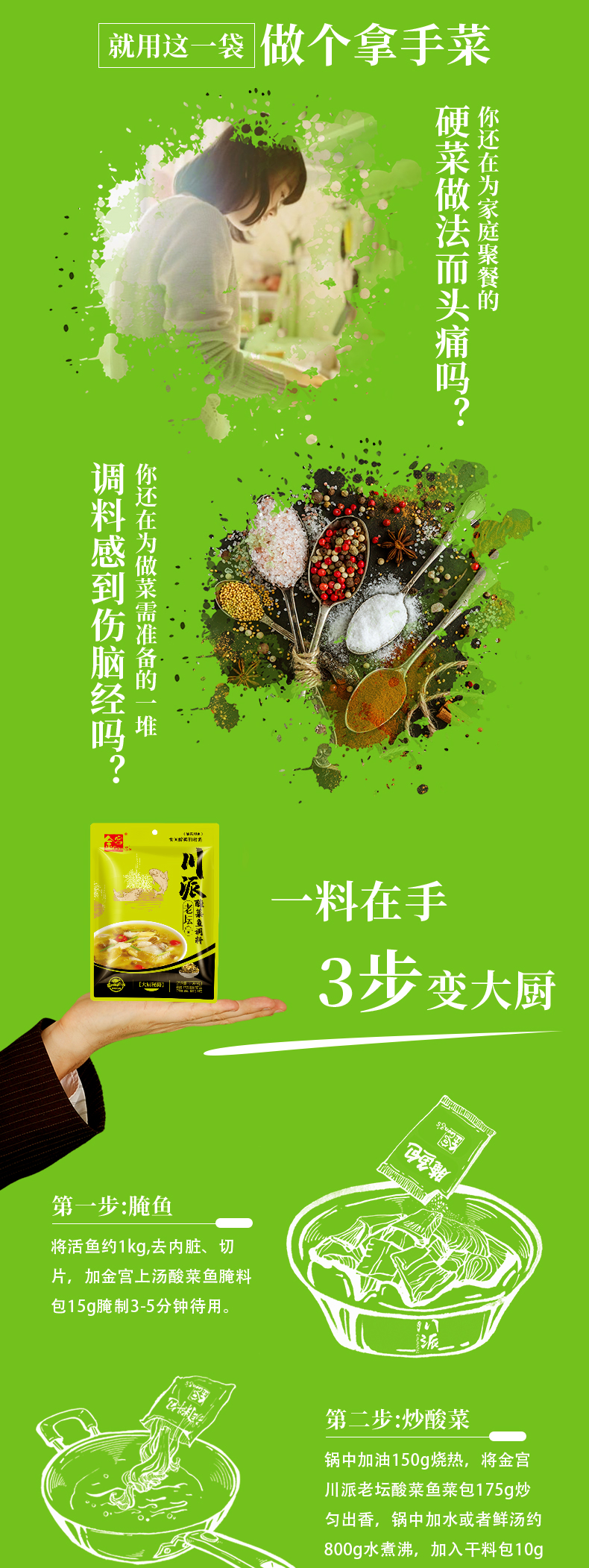 產(chǎn)品簡介:本調(diào)料由金宮川派公司川菜研發(fā)團(tuán)隊(duì)收集川、渝漁翁煮魚的方法,精選四川腌漬大葉芥菜、腌漬蘿卜.腌漬辣椒、腌漬姜等為原料,采用傳統(tǒng)發(fā)酵和現(xiàn)代食品加工新技術(shù),經(jīng)過精心加工而成。酸菜青綠,湯色微黃;酸香沁脾、誘人食欲;充分體現(xiàn)了川派酸菜魚酸香爽脆、湯濃醇鮮、魚肉細(xì)嫩的風(fēng)味特色。