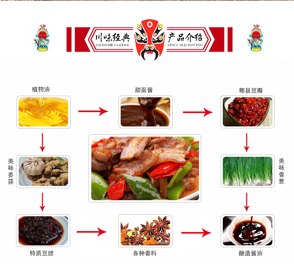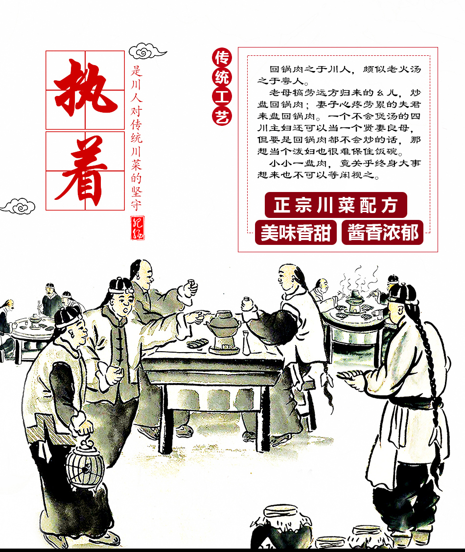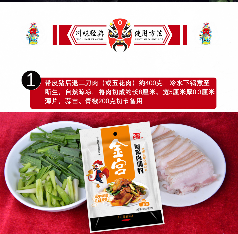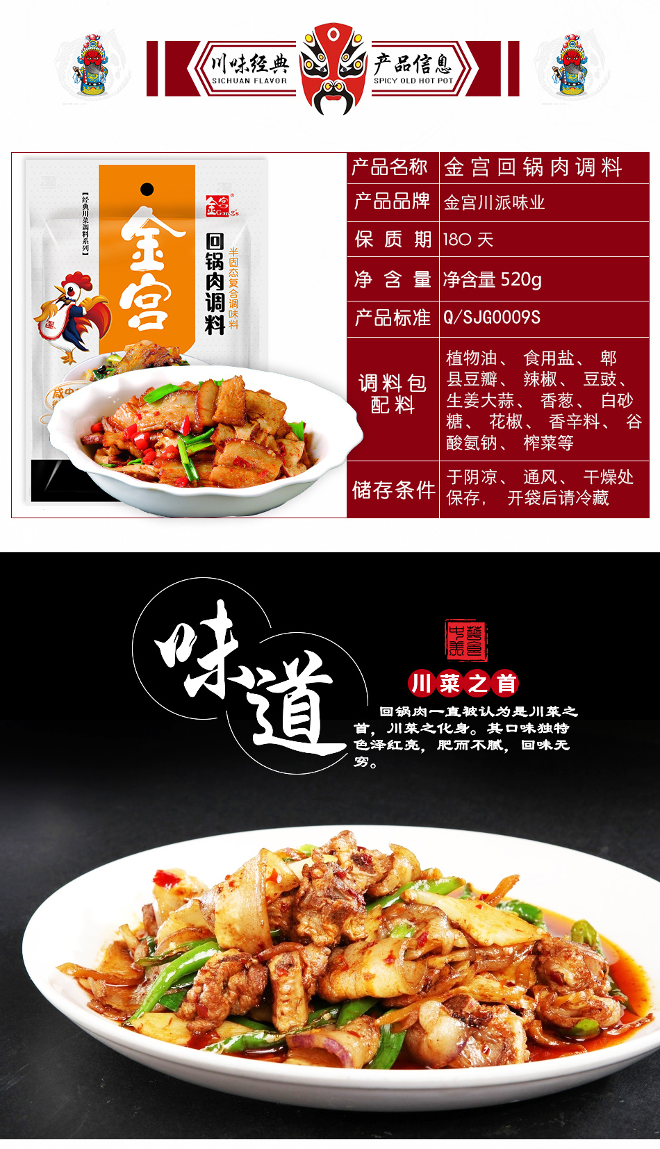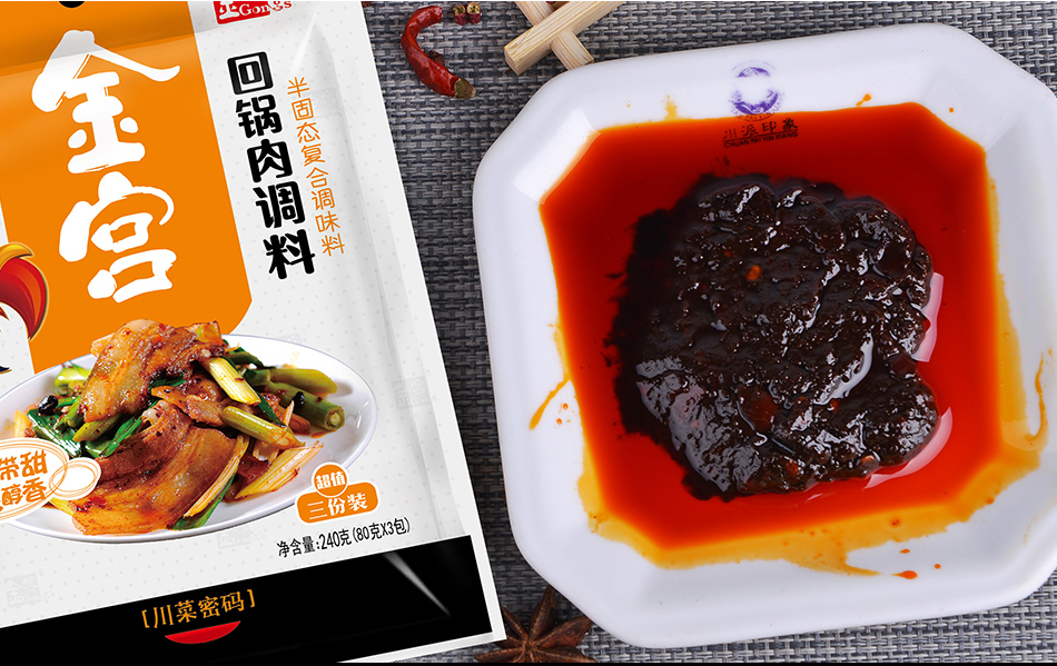 產(chǎn)品簡(jiǎn)介:四川名菜—回鍋肉,古時(shí)即稱"油爆鍋”,成型"燈盞窩”,號(hào)稱"川菜之首”。金宮回鍋肉調(diào)料傳承經(jīng)典,創(chuàng)新研制,成菜紅而不辣,入口咸中回甜,醬香濃郁,肥而不膩。輕松做好四川風(fēng)味回鍋肉,和家人朋友一起分享美味。