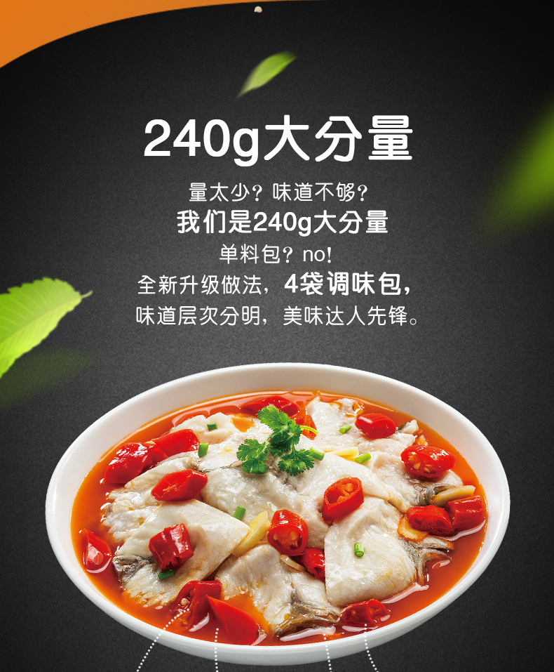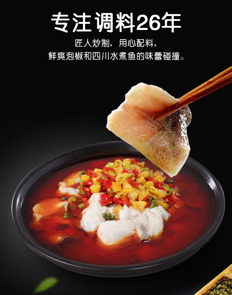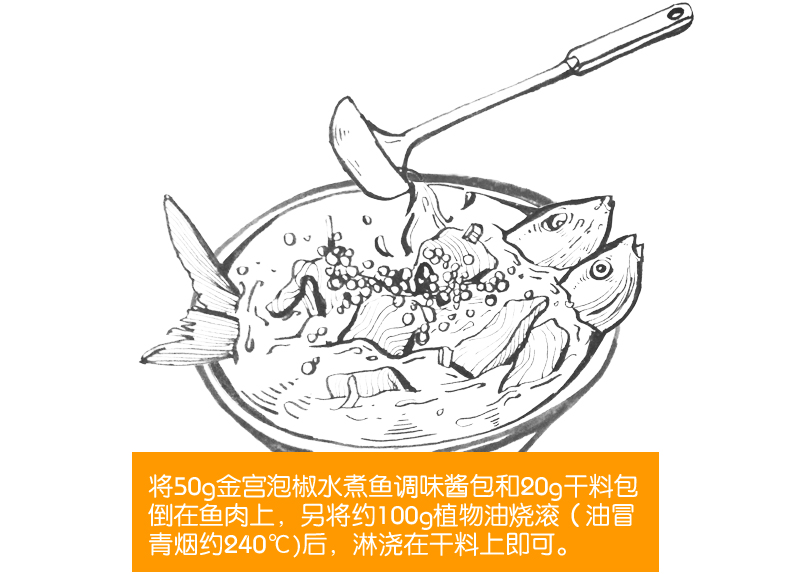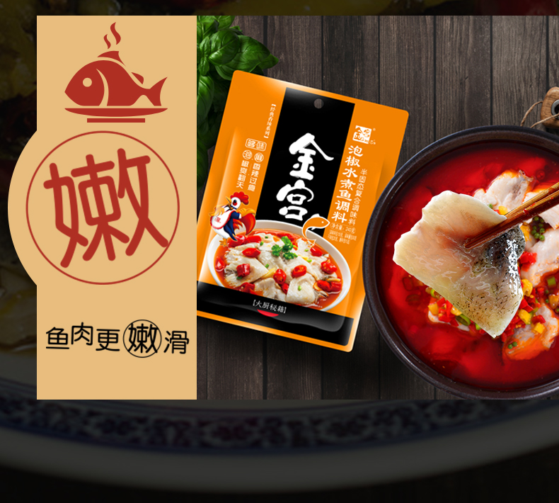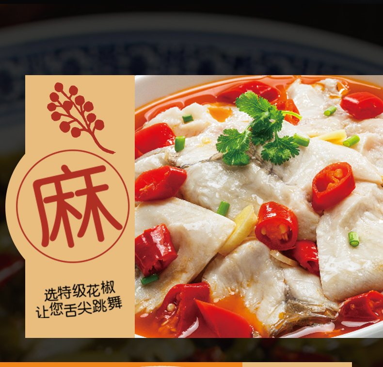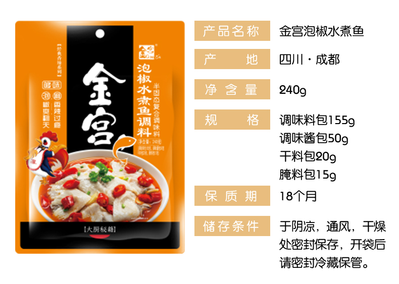 產(chǎn)品簡(jiǎn)介:本調(diào)料是金宮川派公司川菜研發(fā)團(tuán)隊(duì)收集川、渝江河上漁翁煮魚的方法,挑選泡椒(即:腌漬辣椒)、腌漬生姜、腌漬大蒜、郫縣豆瓣、花椒等精心牖炒爆香而成,烹調(diào)出來的魚肉,酸香濃郁,質(zhì)感鮮嫩細(xì)滑,既去除了魚的腥味,又保持了魚的鮮嫩,辣而不燥,辣中見麻。