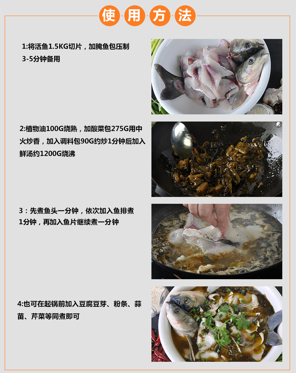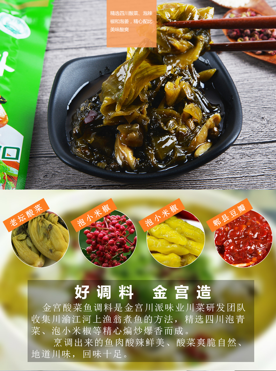 產(chǎn)品簡(jiǎn)介:本品為金言川派味業(yè)川菜研發(fā)團(tuán)隊(duì)收集川渝漁笛煮魚技巧。精心調(diào)配而成。晴選四川泡菜、優(yōu)質(zhì)花駔等食材。讓魚肉酸香可口,回味無(wú)窮。